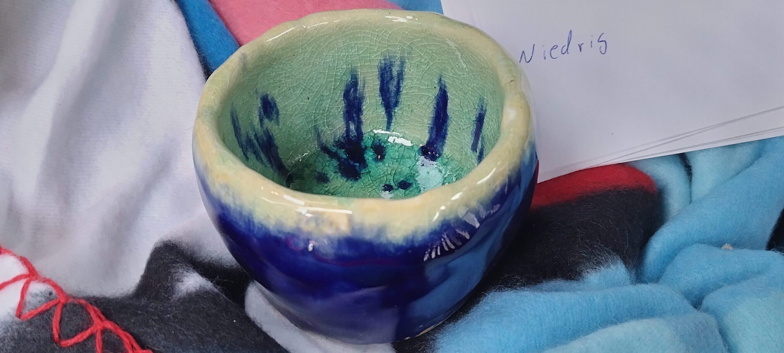 Hand-thrown ceramic bowl in blue-green hues with a glazed surface rests on colorful fabric scraps and papers.