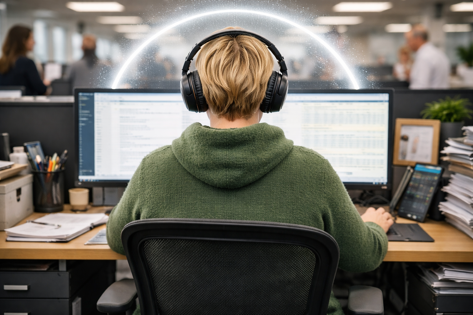 In my case: since my second year in the profession, I’ve often worn headphones1 and I had to realize that many followed my example. I don’t want(!) to leave the environment. But I also can’t(!) fulfill the work that’s due without it (must!).