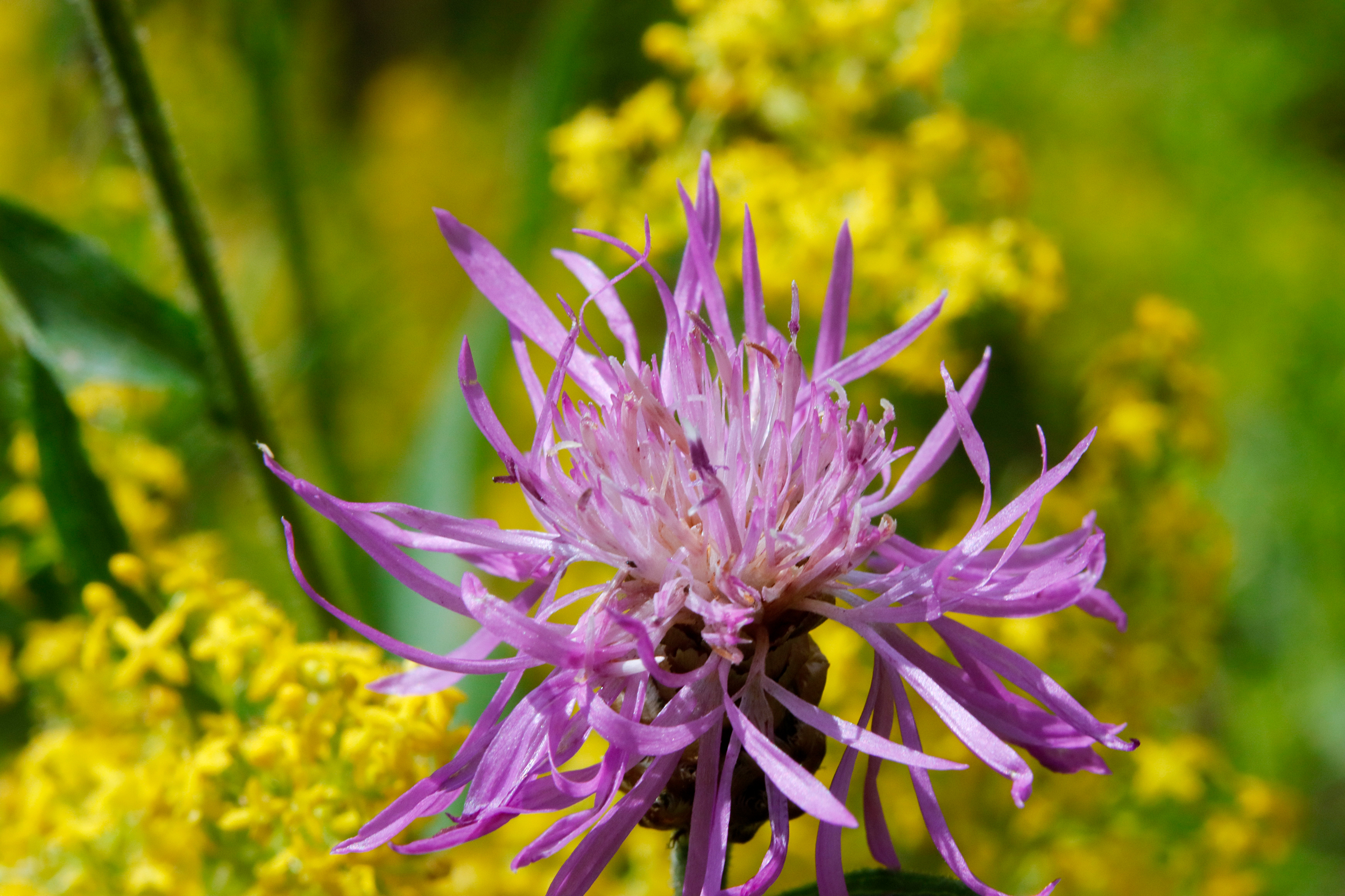 A violet flower with finely branched petals in the foreground. In the background are blurred yellow flowers and green foliage.