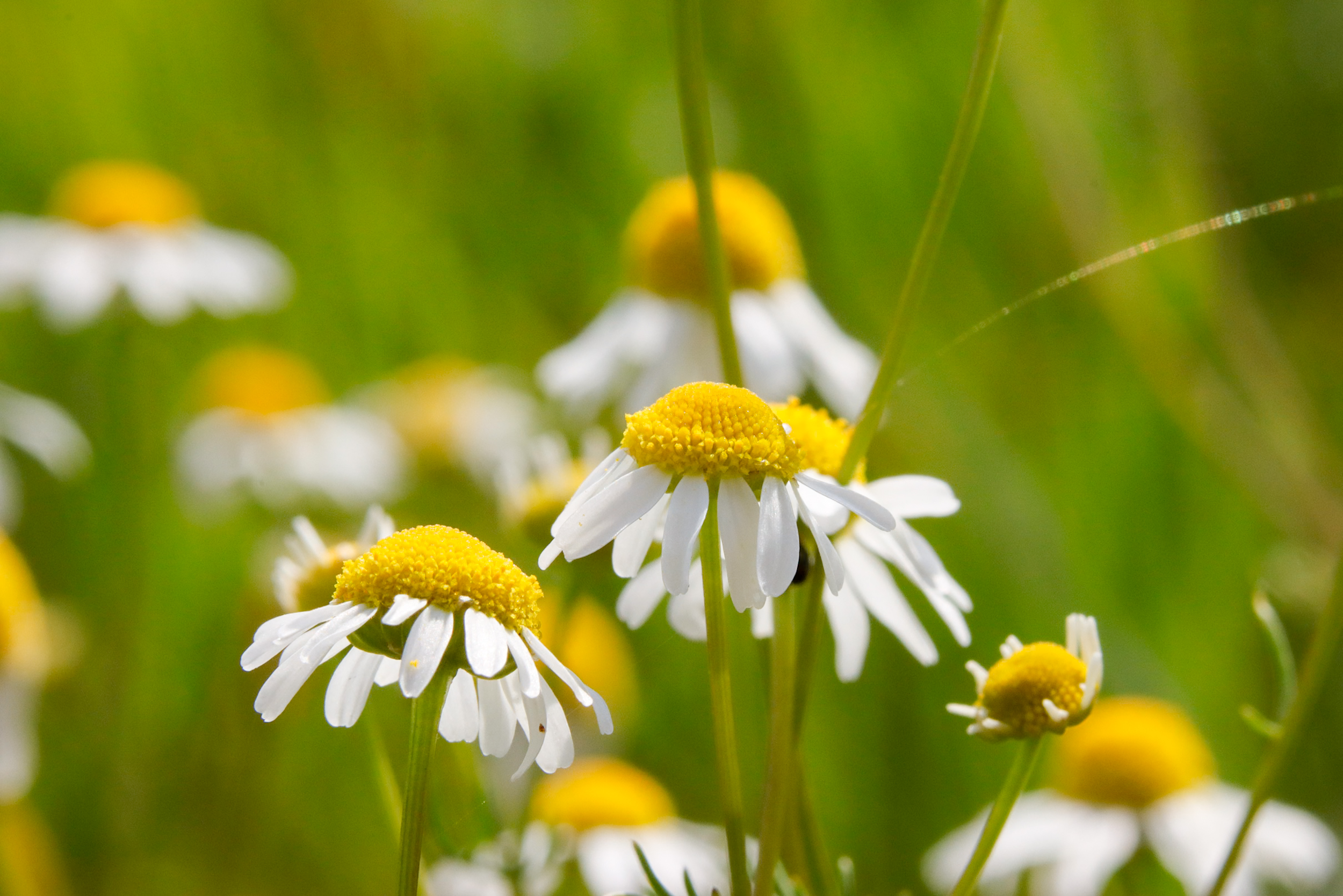 Several white chamomile flowers with yellow centers in a green meadow. The flowers are in different focal planes.
