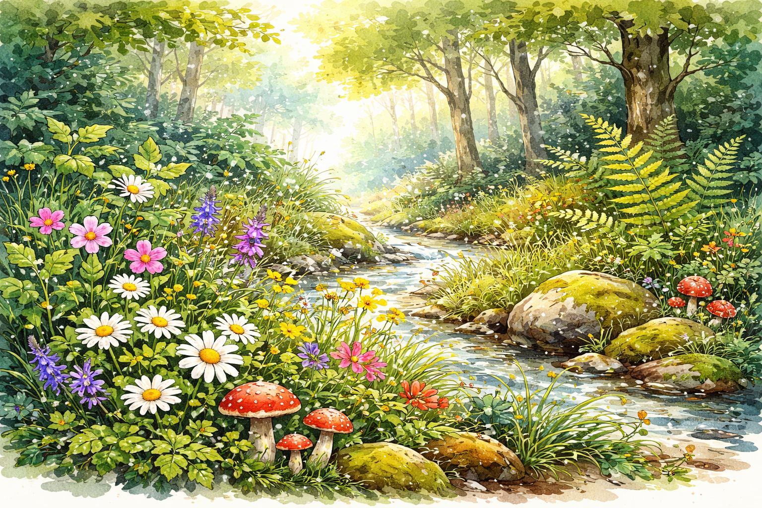 Small violet wildflowers with five petals bloom among green leaves. In the background, more blossoms are out of focus.